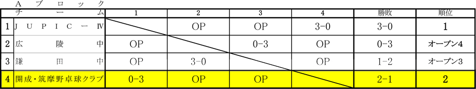 【開成・筑摩野卓球クラブ】 予選リーグ 3勝1敗 2位決勝トーナメント 1回戦敗退